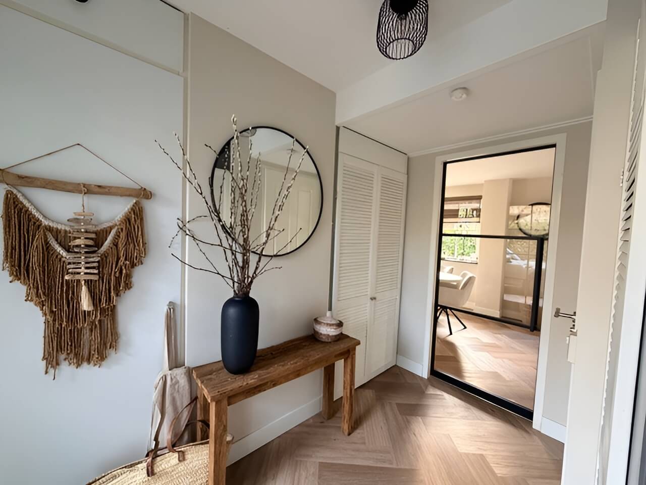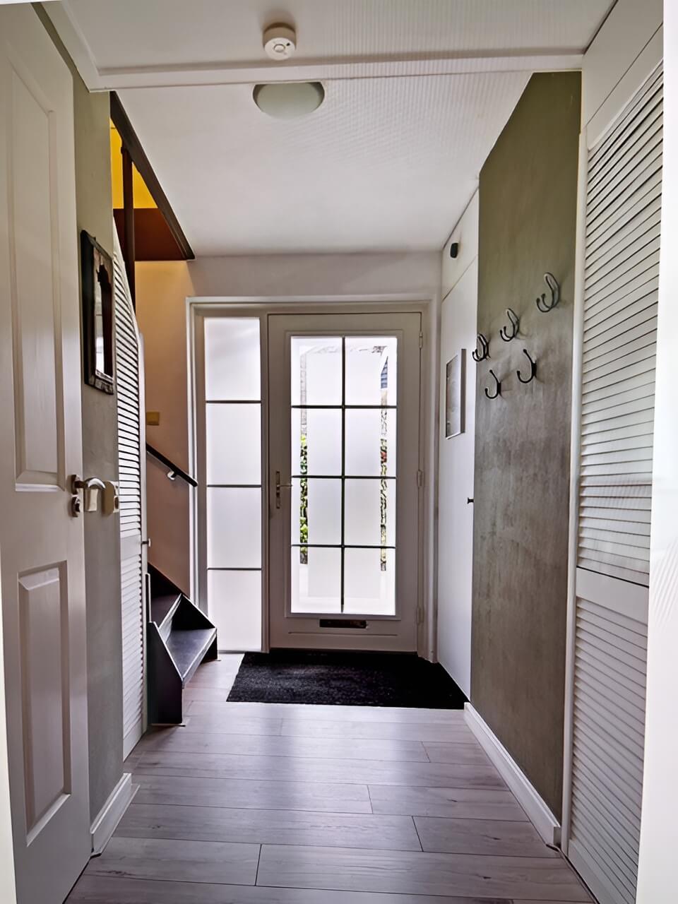 Een bijzonder detail zijn de zwarte stalen deuren met rookkleurig glas tussen de hal en woonkamer. Deze stijlvolle toevoeging versterkt het ruimtelijke gevoel en geeft het interieur een eigentijds accent.