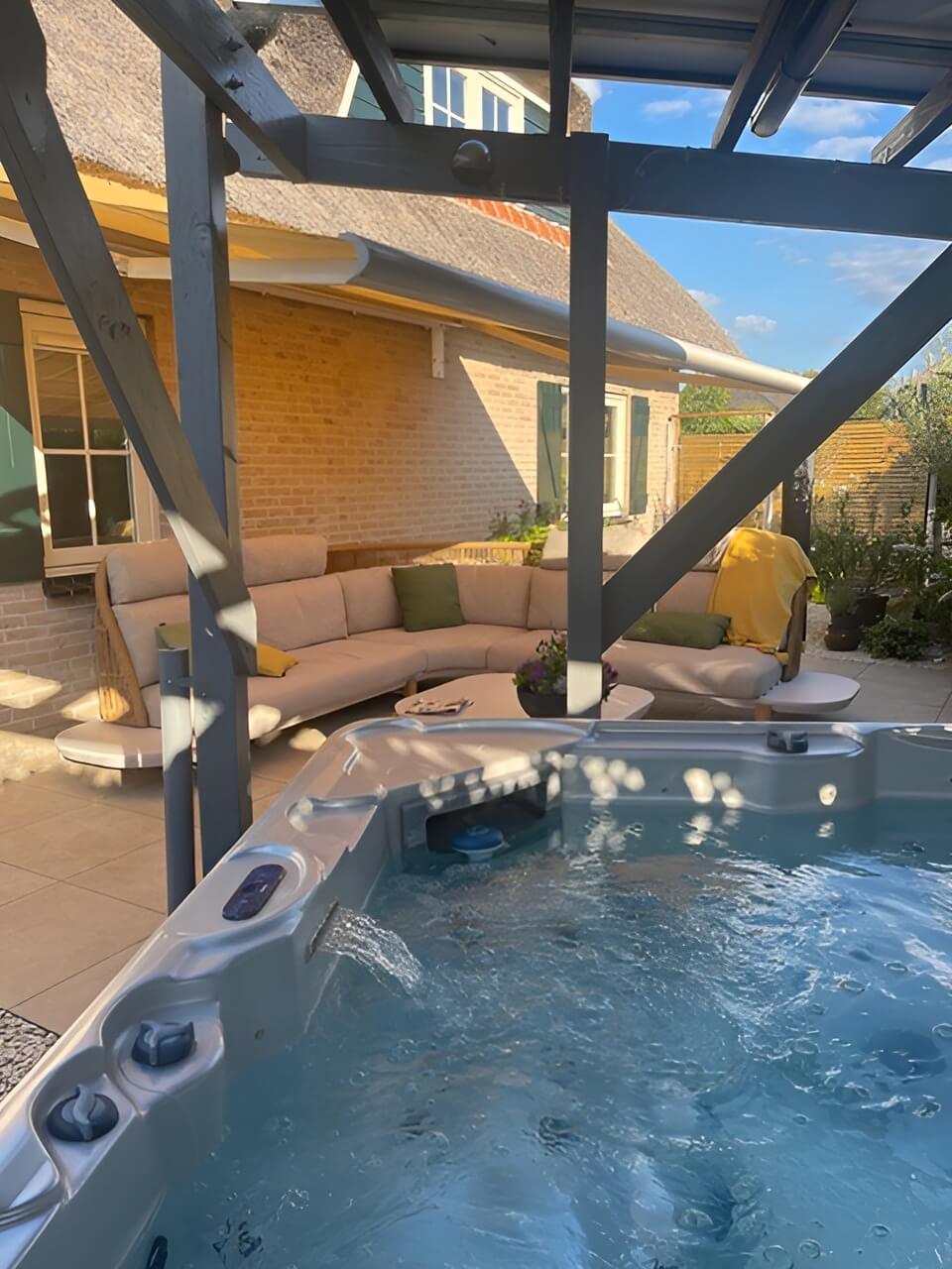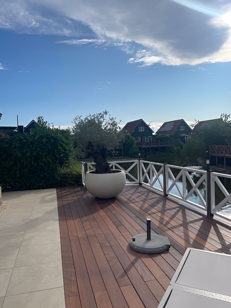 Ook de tuin kreeg een complete metamorfose. Italiaanse keramische tegels, een vlonder van duurzaam Ipé-hout en lichtbeige inveegsplit zorgen samen met Zuid-Europese beplanting voor een ontspannen mediterrane sfeer, een heerlijke plek om van het buitenleven te genieten.