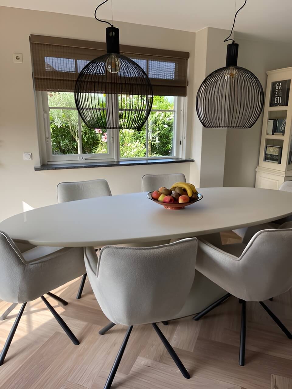 De moderne ovale eettafel in beige betonlook vormt een echte eyecatcher en combineert een robuuste uitstraling met een strak design. Het tv-meubel van gerecycled hout en de bijpassende sidetable brengen extra warmte en karakter in het interieur.