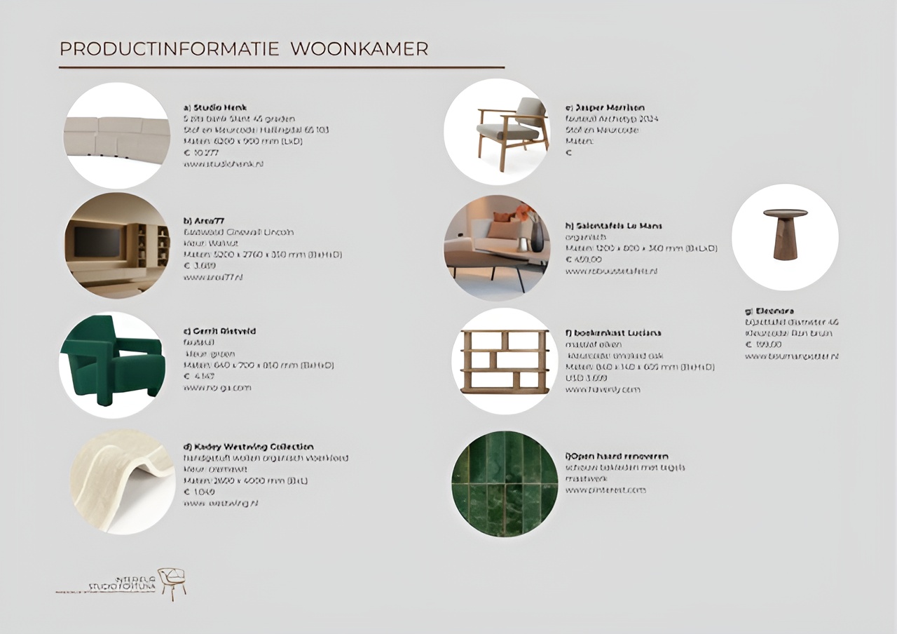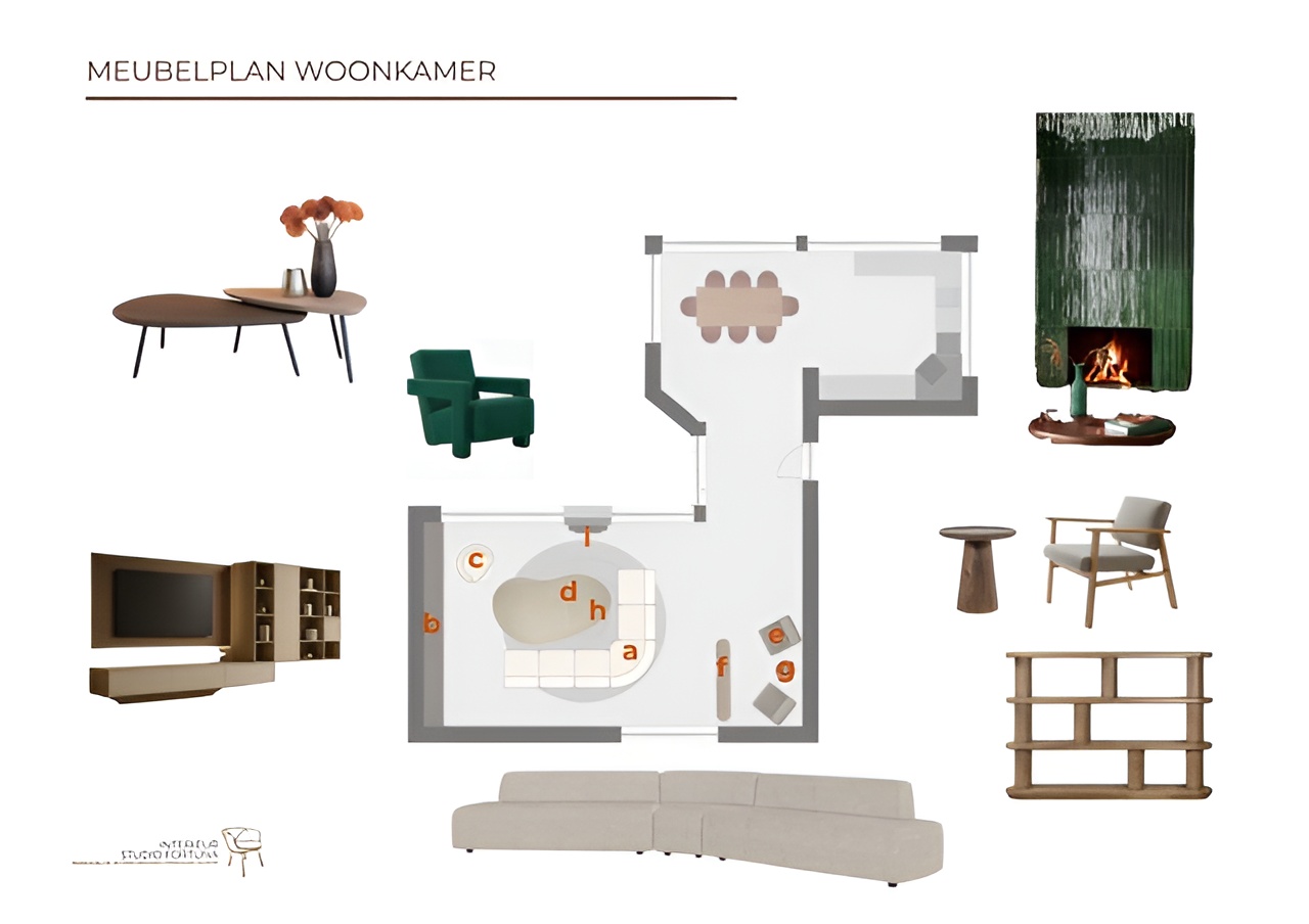 De eettafel van Jasper Morrison vormt het middelpunt van de eetruimte, gecombineerd met stoelen van Edward Barber en Jay Osgerby. In de woonkamer staan fauteuils van Jasper Morrison, een lichte bank van Studio Henk en de iconische groene Rietveldstoel. De open haard krijgt een nieuwe uitstraling met glanzende groene tegels, die mooi aansluiten bij de kleur van de fauteuil.